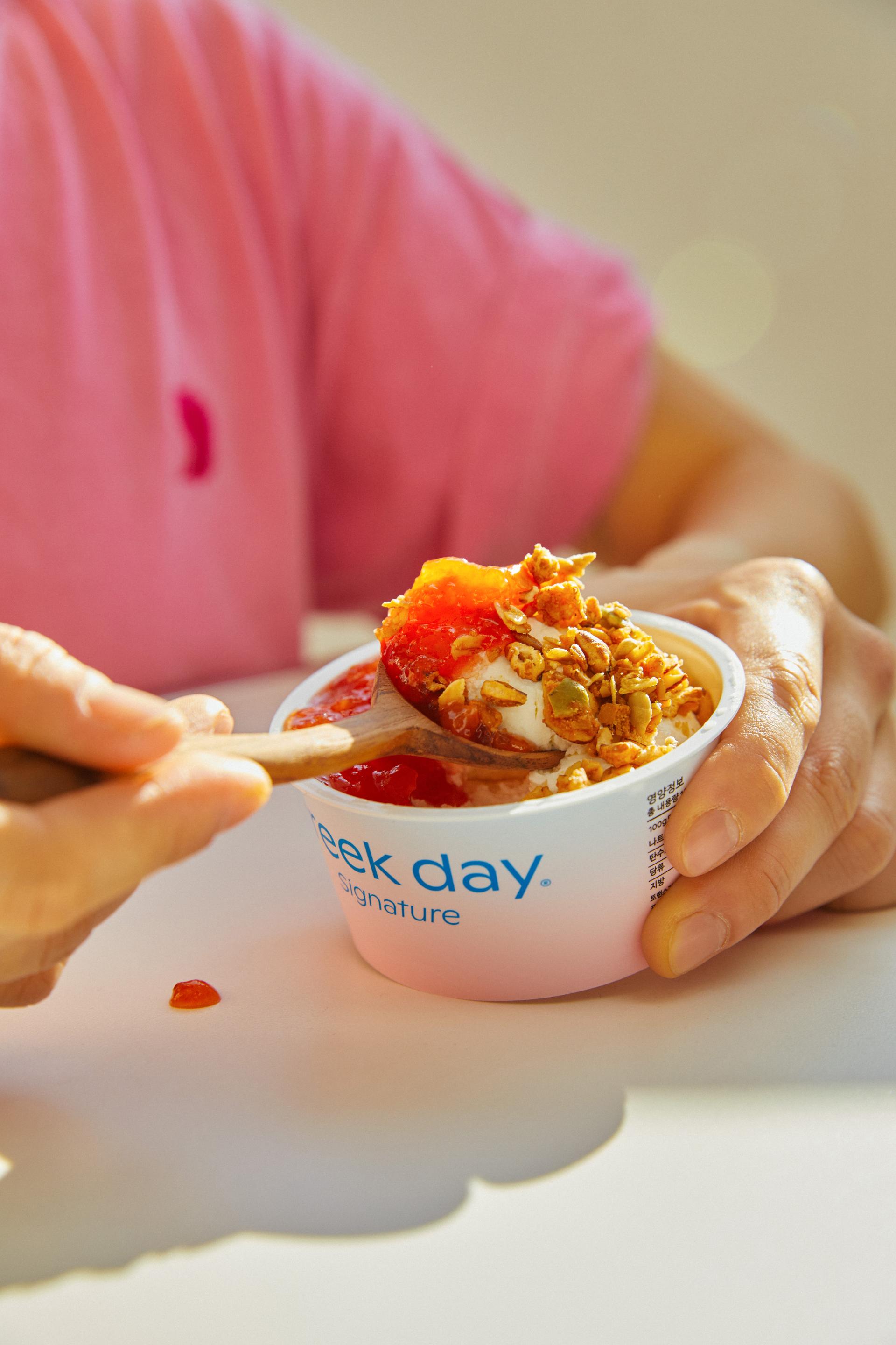 스위트바이오의 그릭요거트 브랜드 '그릭데이'와 함께 커머스 기획전을 진행했습니다. 'ABC(Achim Breakfast Catalog)'라는 테마에 맞춰 그릭데이의 시그니처 제품 2가지와 그와 어울리는 스푼 2가지, 그릭데이를 소개하는 내용이 담긴 종이 카탈로그를 함께 구성해 판매했습니다. 또한 그릭데이 제품의 결이 돋보이는 감각적인 사진과 영상을 별도로 제작해 큰 호응을 이끌었습니다.