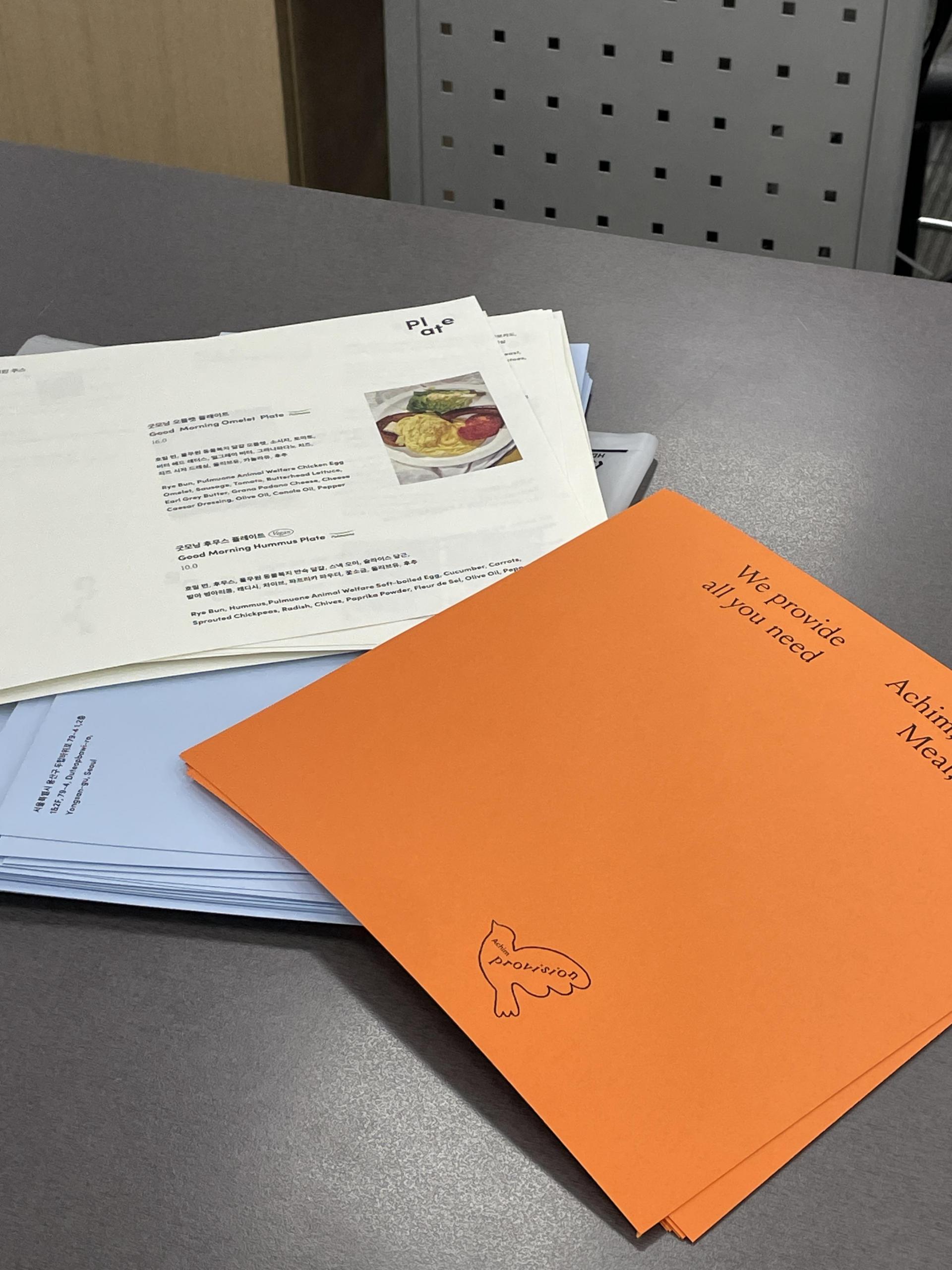 천재 디자이너 다혜 님의 아이디어로 Achim의 키컬러인 오렌지색 표지와 하늘색 속표지, 내지를 서로 다른 판형으로 엮은, 어디서도 본 적 없는 메뉴북을 완성했다. 메뉴북을 본 손님의 감탄을 들을 때마다 뿌듯했지만, 보완할 점들이 금세 하나둘 나타나기 시작했다. 우선 스테이플러로 고정한 중철 제본이기에 종이가 쉽게 떨어졌다. 아침 프로비전이 신선한 재료 사용을 지향하는 만큼 음식 안에 들어가는 재료를 모두 기재했는데, 맛이 잘 설명되지 않는지 손님들로부터 “그러니까 이게 어떤 메뉴인 거예요?”라는 질문을 자주 받았다. 또 내지에 음식 사진을 최소한으로만 넣었더니 사진이 들어간 메뉴에만 주문이 쏠렸고, 운영하면서 추가되거나 빠진 재료가 늘었고, 인쇄 전까지는 보이지 않던 오탈자가 눈에 들어왔고⋯. 여름을 앞두고 우리는 다시 한번 결심했다. 여름 시즌 메뉴 런칭에 맞춰 메뉴북을 리뉴얼하기로.