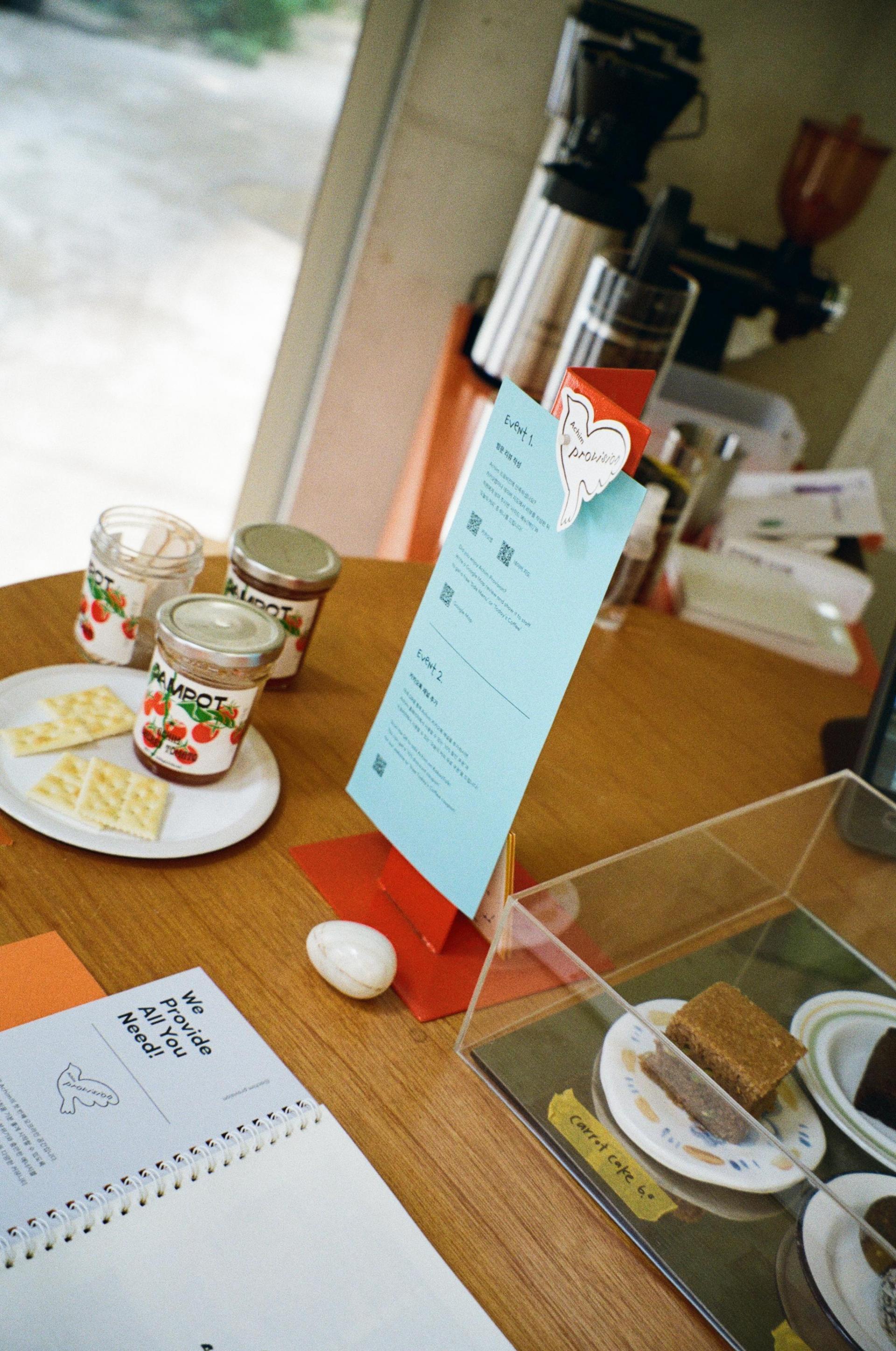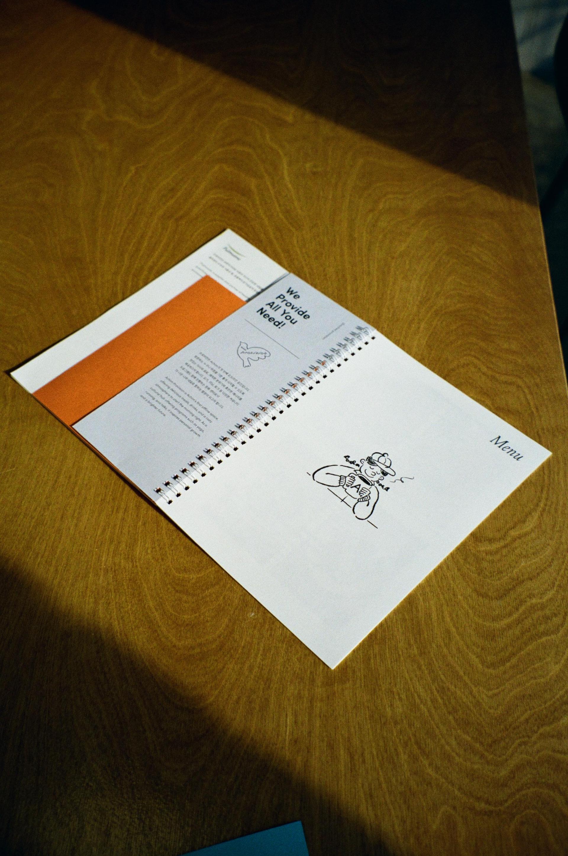 팀원 모두가 며칠을 두고 아이디어를 쏟아냈지만, 어느 쪽도 마음에 쏙 들지 않았다. 우리가 전하고 싶은 건 단순히 메뉴만이 아니었으니까. Achim은 어떤 브랜드인지, 프로비전이라는 공간은 어떤 곳인지, 이곳에서 우리가 어떤 문화를 만들고 싶은지 두루 담고 싶었다. 매거진에서 출발한 팀답게 할 말이 많은 우리는 결국 결심했다. 메뉴‘판’이 아니라 메뉴‘북’을 만들기로.