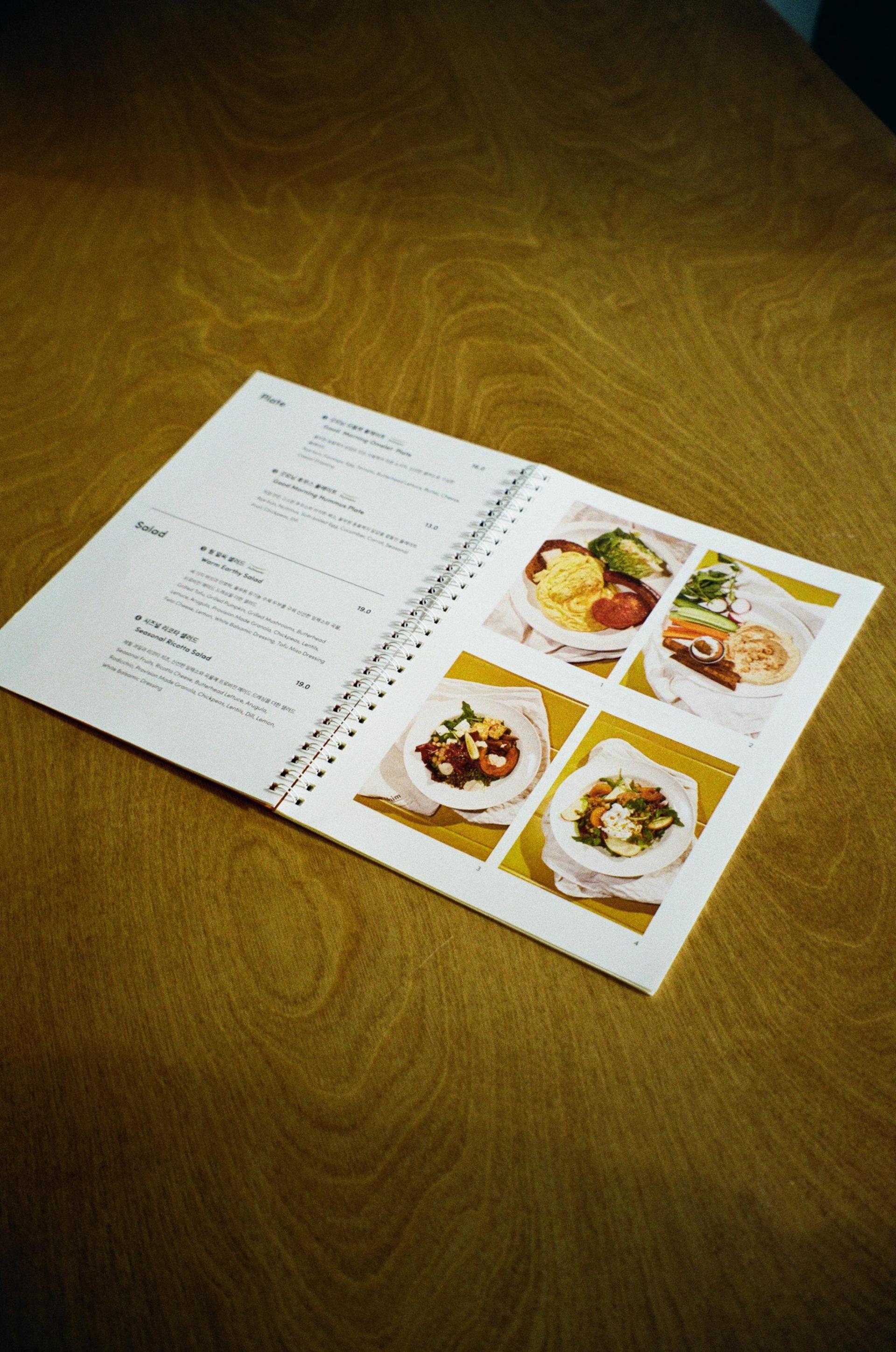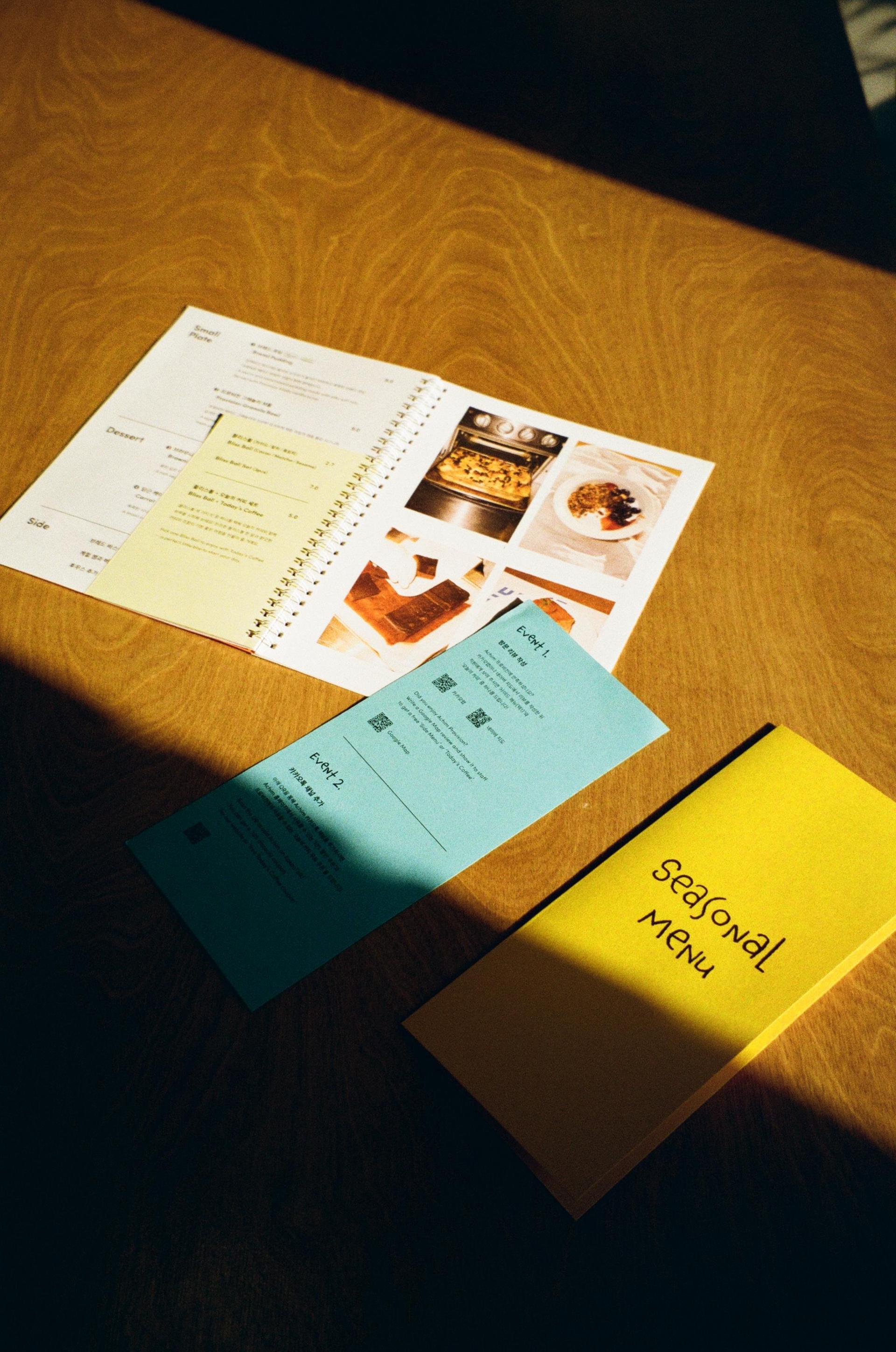 이전의 아쉬움을 꼼꼼히 보완해 새로운 메뉴북을 만들었다. 페이지가 쉽게 떨어지지 않는 스프링 제본으로 바꾸었고, 모든 음식에 사진과 설명글을 병치해 음식 맛을 단번에 파악할 수 있도록 했다. 오탈자도 바로잡았으며, 시즈널 메뉴는 노란색 간지로 따로 묶어 시선을 끌었다. 또 아침 프로비전의 시그니처 디저트인 블리스볼과 이벤트 안내를 별도의 색지로 구성한 결과 주문량과 참여율이 눈에 띄게 늘었다. 리뉴얼된 메뉴북을 보고 외주 제작을 문의하신 손님까지 계셨으니, 두 달 가까이 공을 들인 보람을 톡톡히 느꼈다.