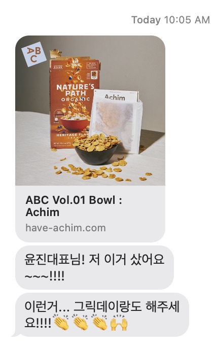 지난 3월 5일자 일영모(일요영감모음집)를 받아 보신 분들은 아실 텐데요. ABC Vol.02는 아주 반가운 제안으로부터 시작되었어요. “이런 거… 그릭데이랑도 해 주세요!” 그릭요거트 브랜드 그릭데이의 담당자 분께서 ABC를 인상 깊게 경험하시고 함께하면 좋겠다는 의사를 보내 주셨죠. 이제 막 발을 뗀 Achim의 기획 상품에 모닝 오너 분들뿐 아니라 브랜드에서까지 호응을 보내 주시다니! 게다가 시리얼만큼이나 더할 나위 없는 아침 식사 메뉴인 그릭요거트를 선보일 수 있다니! 뜻하지 않게 찾아온 기회에 감사하며 Achim 팀은 ABC Vol.02를 준비하기 시작했습니다.