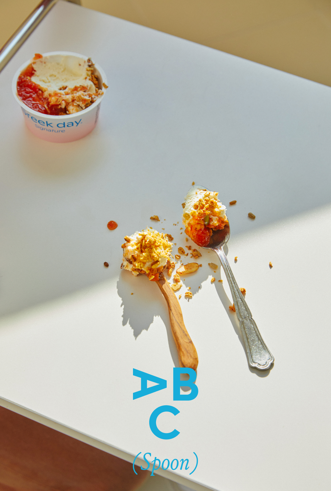 ABC Vol.02를 준비하며 개인적으로 얻은 귀중한 수확 중 하나는 그릭데이라는 브랜드를 알게 된 게 아닐까 싶습니다. 국내에선 낯선 음식이었던 그릭요거트를 대중화하기 위해 신맛을 최소화할 수 있는 새로운 그릭요거트를 직접 개발하고, 수제 품질을 유지할 수 있는 생산 프로세스를 만들어 나가고, 사이드 토핑 하나 허투루 만들지 않는 이 브랜드를 탐구하며 얼마나 ‘진심’으로 임하는지 배울 수 있었어요. 바로 그 점이 Achim과 일맥상통하는 부분이라는 생각도 들었구요. 그렇기에 이번 협업이 하나부터 열까지 전부 ‘자연스럽게’ 흘러올 수 있었던 것 같습니다.