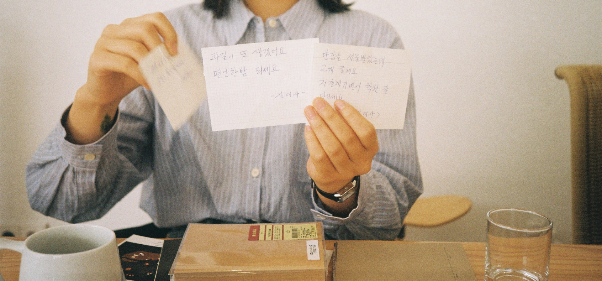 마지막으로 연정 님은 작고 두툼한 무인양품 노트에 담은 기록들을 공유했다. 연정 님은 퇴사 후 한 달이 넘는 시간 동안 많은 혼란을 겪었는데, 그때마다 글을 쓰면 마음속 응어리들이 사라졌다고 한다. 아침에 일어난 직후에 쓰기를 좋아하는데, 기상 후 45분간은 마음에 방어 기제가 작동하지 않아 스스로를 오롯이 마주할 수 있기 때문이라고. 또 타인의 글도 자신의 글처럼 소중히 여길 줄 아는 연정 님은 노트에 끼워 둔 이웃의 쪽지와 흰 종이에 적어 둔 작가 사무엘 울만의 시 ‘청춘’을 담담한 목소리로 나누어 주었다. “우리는 언제나 청춘이다. 그러니 안테나가 꺾일 때, 정신이 냉소로 가득찬 눈과 비탄이란 얼음으로 뒤덮일 때, 우리는 늙은이가 되네, 스무 살조차도. 안테나를 올리고 희망의 물결을 붙잡는 한, 그대 여든 살이어도, 늘푸른 청춘이네.”