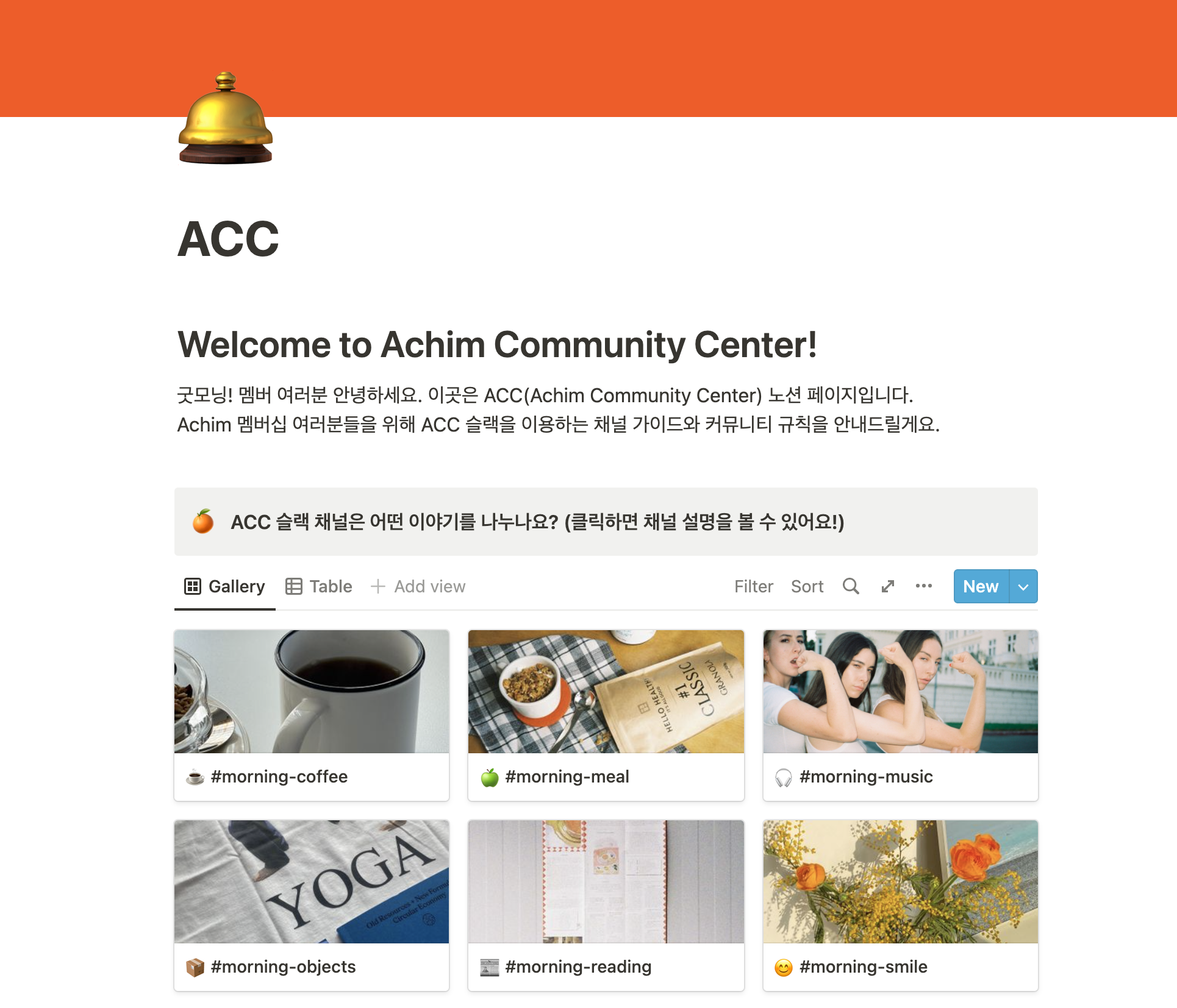 우리가 어디서 모이면 좋을지 고민을 이어가다 온라인 커뮤니케이션 툴 ‘슬랙(Slack)’이 생각났어요. 여러 가지 채널을 동시에 운영할 수 있고, 사진이나 글을 업로드하기 쉬우며, 간단한 이모지로도 부담 없이 반응을 남길 수 있다는 장점이 있으니 상상 속 공간을 구현하기에 적합하다 싶었죠. 2014년 첫 회사에 입사했을 때부터 사용해온 툴이라 저에게는 무척 익숙했지만, 처음 써 보시는 분들도 계실 것 같아 다른 툴도 여럿 알아보았는데요. Achim이 지향하는 공간을 슬랙만큼 제대로 구현할 수 있는 곳은 없겠더라고요. 결국 뚝딱뚝딱 Achim 슬랙 플랫폼 ‘ACC(Achim Community Center)’를 오픈하게 됩니다. 사용 안내와 콘텐츠 아카이브를 위해 별도로 노션 페이지도 만들었어요. 우려와 달리 모두 편히 사용해주시는 것 같아 현재는 슬랙만 열어 두고 있고요.