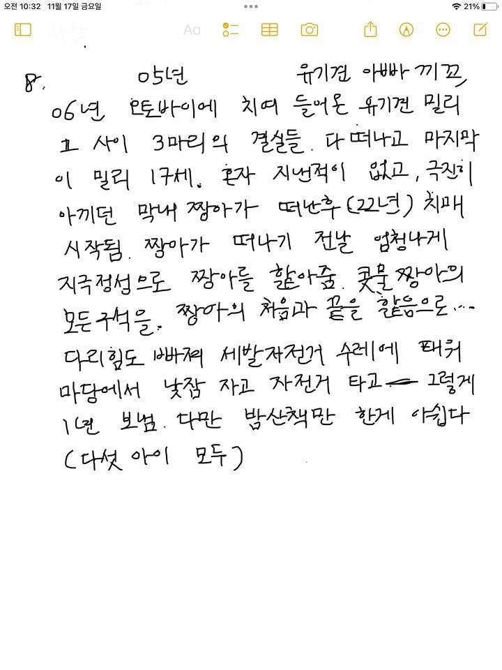 ‘반려견 밀리가 무지개다리를 건넜다는 소식을 인스타그램으로 접하고 마음이 아팠습니다. 밀리를 만나고 떠나보내기까지의 과정은 어땠는지, 밀리와의 추억에 대해 조심스럽게 여쭤보고 싶습니다.’라는 질문에 대한 답