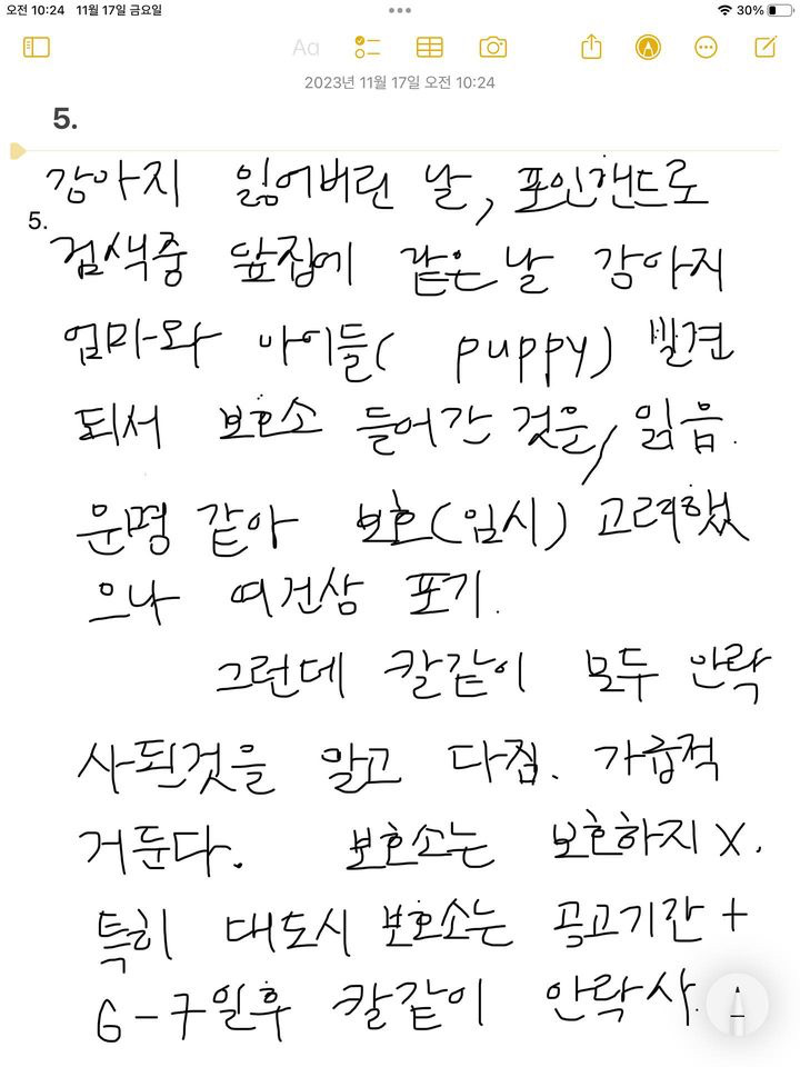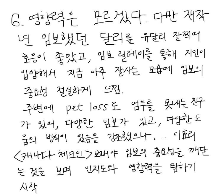 원래는 행순이도 임보만 하려고 했는데, ‘반품’될 것 같더라고요. 입양 보내면. 그래서 포기하고 제가 키우고 있어요. 엄청 예쁘게 생겼어요. 잘생기고. 기운 센 걸 알아보는 사람들은 알아보더라고요. “뒷다리 근육 봐라? 너 힘 세지?” 이러면서.